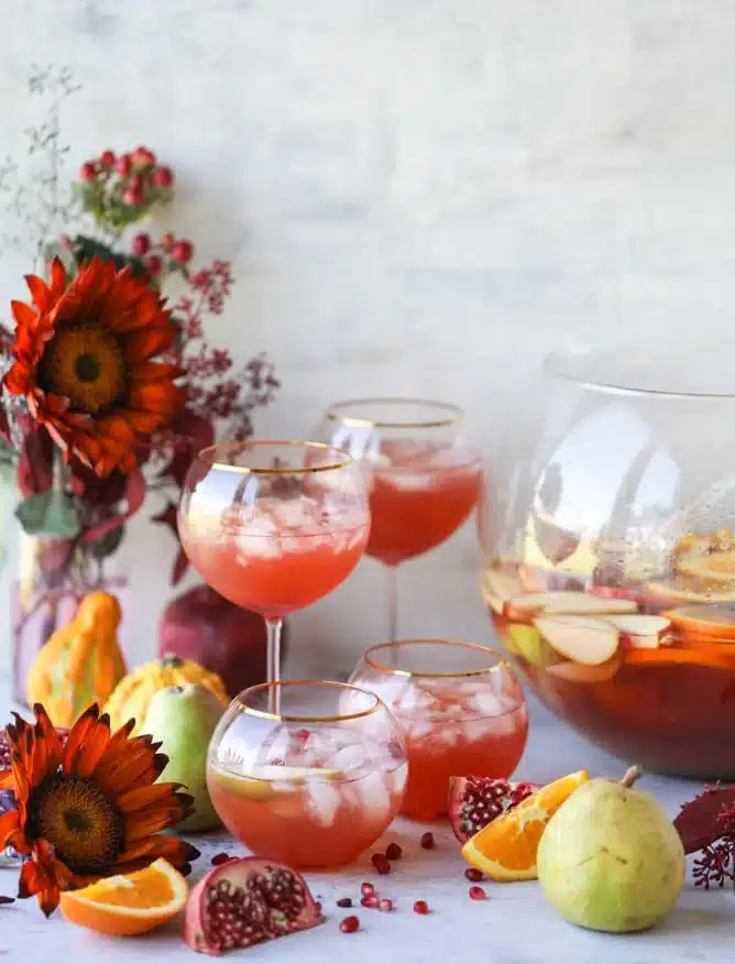 I have so many options for you! There’s a few cocktails, some non-alcoholic options, hot drinks and more. While there are a few punch recipes, the rest are single serving cocktails and would be super easy to make for a small crowd.