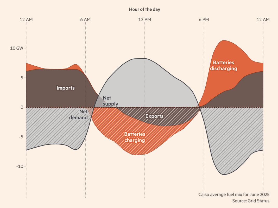 When there is an excess of solar energy during the day, it can be stored in batteries for use in the evening when the sun goes down. Financial Times, in a chart forward piece, describes how this applies at scale, using California as a prime example.
